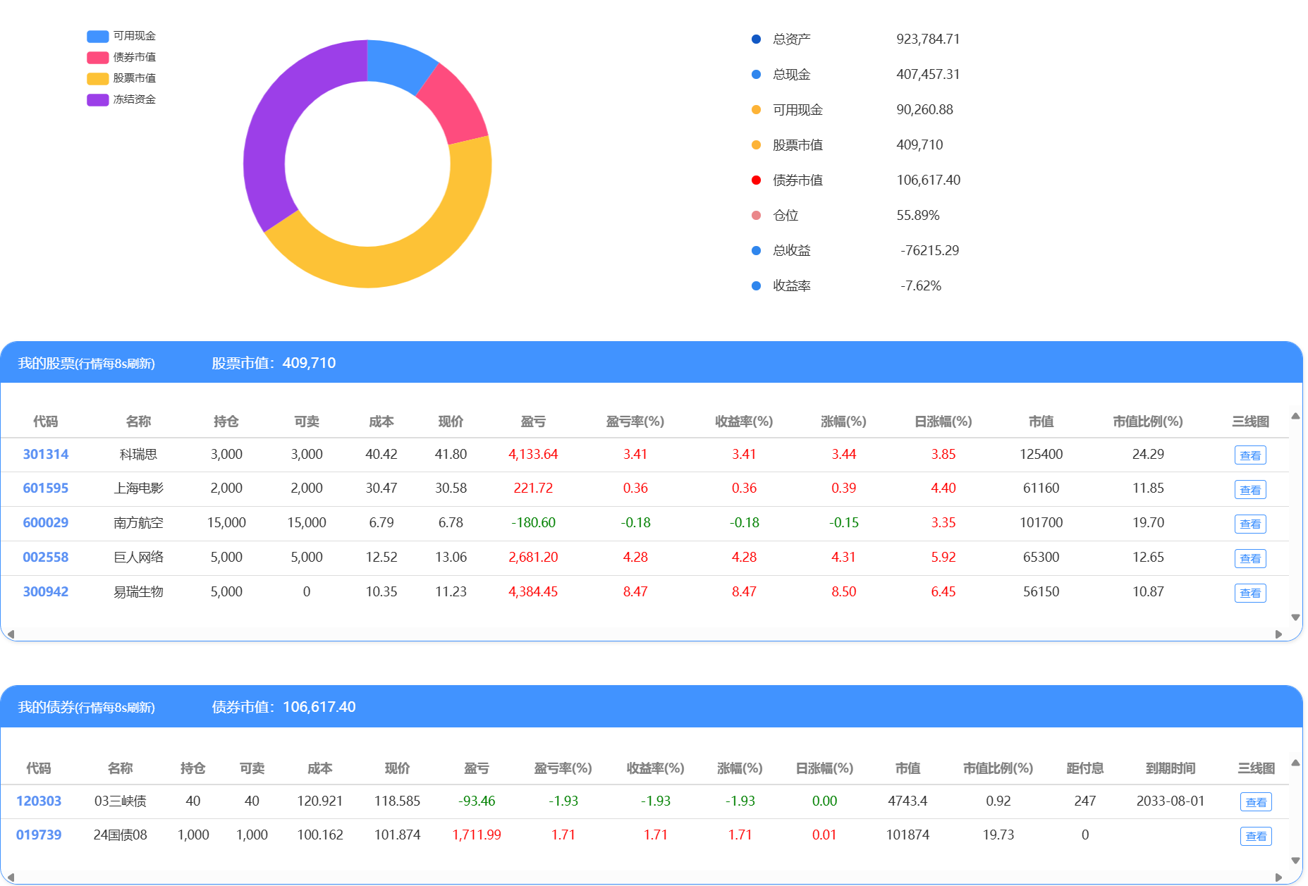 总体来看,我的总资产为923,784.71元,其中股票市值占比较大,达到409,710元。仓位为55.89%,表明我目前的投资较为积极。然而,由于上周的股市行情,之前购买的海信家电、新城控股、招商蛇口给我造成了巨大的亏损,因此已经挂单卖出。目前总收益为-76,215.29元,收益率为-7.62%,显示出我的投资组合在当前阶段处于亏损状态。