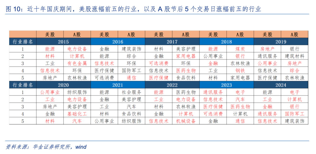 过往节后A股的科技成长和部分周期行业表现不错,A股领涨行业和假期期间美股领涨行业相关度较高,如2015年的能源、材料和信息技术,2016年的信息技术,2017年的可选消费和医疗保健,2018年的能源和金融,2019年的房地产和公用事业,2020年的公用事业、工业和材料,2022年的能源、工业和信息技术,2023年的通讯服务、信息技术、医疗保健和可选消费,2024年的工业、金融、通讯服务和信息技术。
