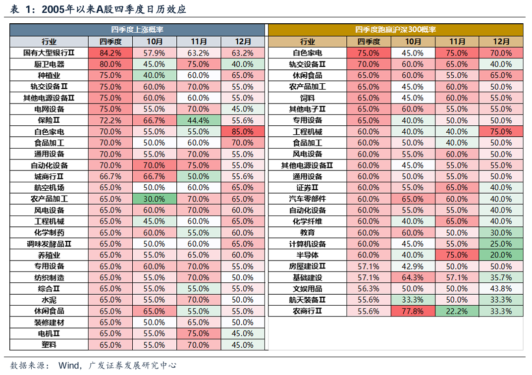 对于四季度走势,广发策略指出,统计回溯05年以来市场,部分顺周期板块在四季度呈现出较为明显的日历效应。按照申万二级分类,2005年至今四季度上涨概率超65%、且跑赢沪深300概率在60%以上的行业仅12个,分别是厨卫电器、轨交设备、其他电源设备、白色家电、食品加工、通用设备、自动化设备、农产品加工、风电设备、工程机械、专用设备、休闲食品。这类行业相比于其他周期板块而言业绩波动率略低,但仍有赖于相对平稳的宏观预期。
