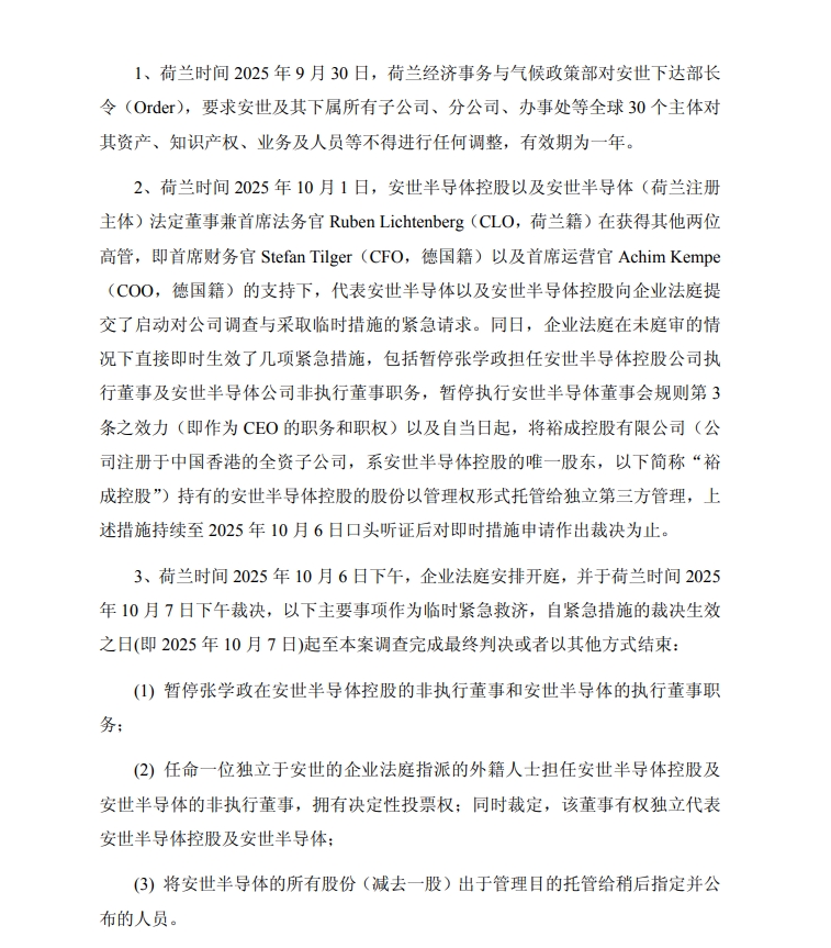 10月12日,闻泰科技公告,近期,公司子公司安世半导体以及安世半导体控股(合称“安世”)收到荷兰经济事务与气候政策部下达的部长令(Order)和阿姆斯特丹上诉法院企业法庭(简称“企业法庭”)的裁决。荷兰时间2025年9月30日,荷兰经济事务与气候政策部对安世下达部长令(Order),要求安世及其下属所有子公司、分公司、办事处等全球30个主体对其资产、知识产权、业务及人员等不得进行任何调整,有效期为一年。