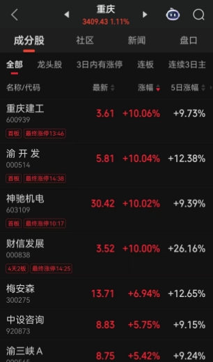 受此影响,A股午后重庆本地板块遭到资金爆炒,重庆建工直线涨停,渝开发、财信发展随后涨停,中设咨询、重庆港、渝三峡、重庆路桥等纷纷大涨。