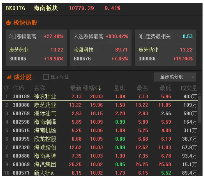 22日,海南自由贸易港迎来封关后的第5天,海南板块集体爆发,板块内掀起涨停潮。截至收盘,该板块指数收涨9.41%,共有22只个股收获涨停,其中,神农种业、康芝药业双双实现“20CM”涨停,海南瑞泽、海汽集团、海南海药纷纷实现“两连板”。