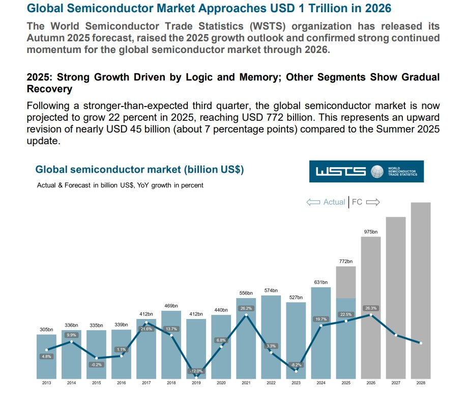 WSTS预计继2024年强劲反弹之后,2025年全球半导体市场将增长22.5%,总价值将达到7722亿美元,高于WSTS春季给出的展望;2026年半导体市场总价值则有望在2025年的强劲增长基础之上大举扩张至9755亿美元,接近SEMI预测的2030年1万亿美金的市场规模目标,意味着有望同比大增26%。
