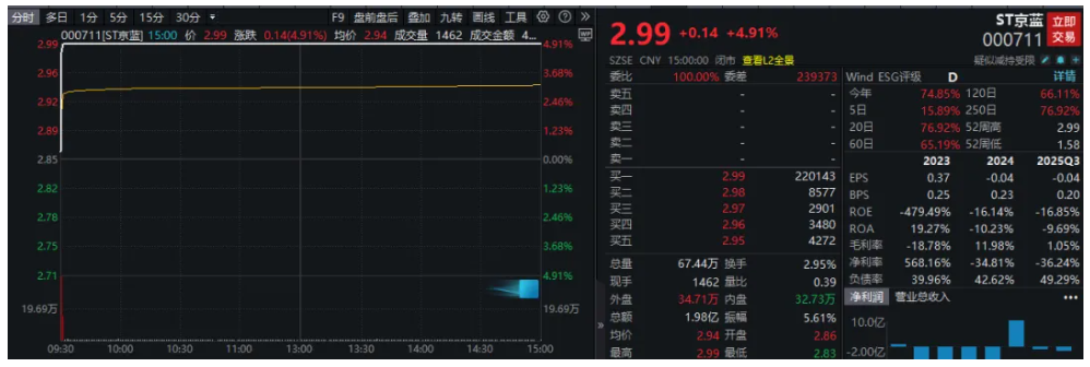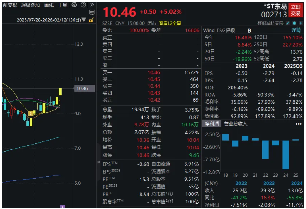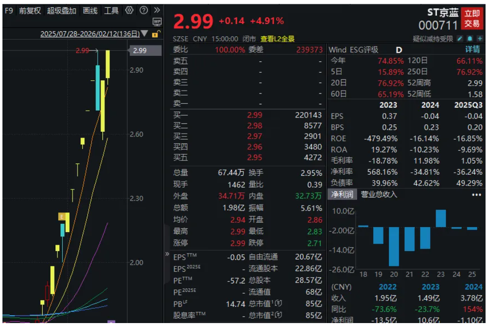 据此前披露的公告,2025年ST京蓝归母净利润预计亏损1.6亿元至2.3亿元,亏损金额较上年同期进一步扩大。公司提示,预计2025年度经营业绩存在明显下滑,当前股价涨幅与公司经营业绩严重偏离。