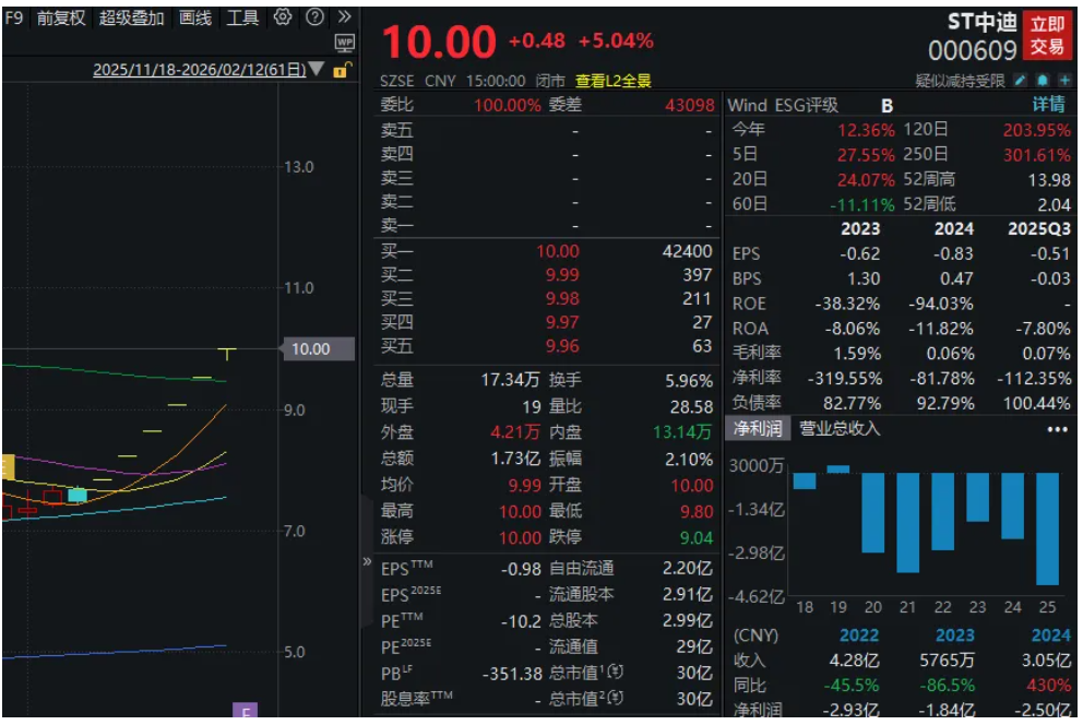 “绩差股”股价大幅上涨的不止ST京蓝。三年(2022年至2024年)累计亏损超过20亿元的家居名企*ST东易今日股价再度实现涨停,拿下“10天6板”。自2025年9月26日*ST东易披露遴选重整投资人结果及签署重整投资协议暨预重整进展后,公司股价已累计上涨超过170%。