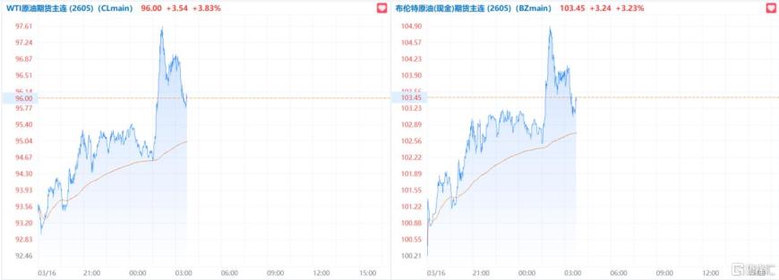 其中,WTI原油期货一度涨超5%,现回落涨超3%报96美元,布伦特原油期货现涨超3%报103.45美元。